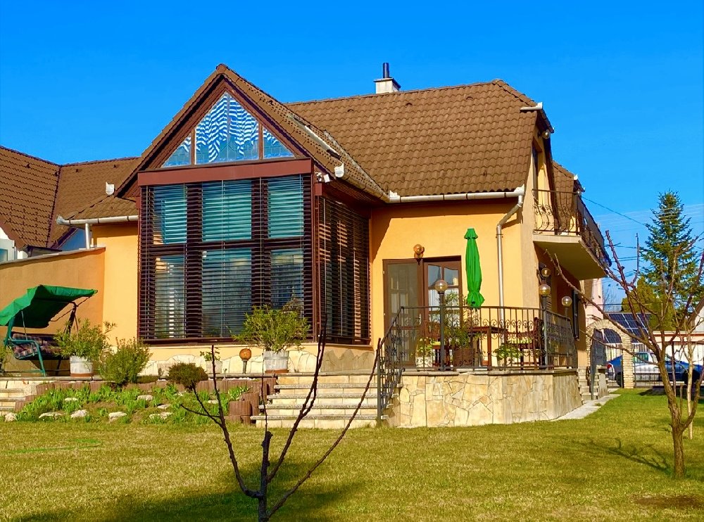 - a homlokzati nyílászárók kerete szintén fából készült, dupla üvegezéssel, fa zsalugáter árnyékolással felszerelve